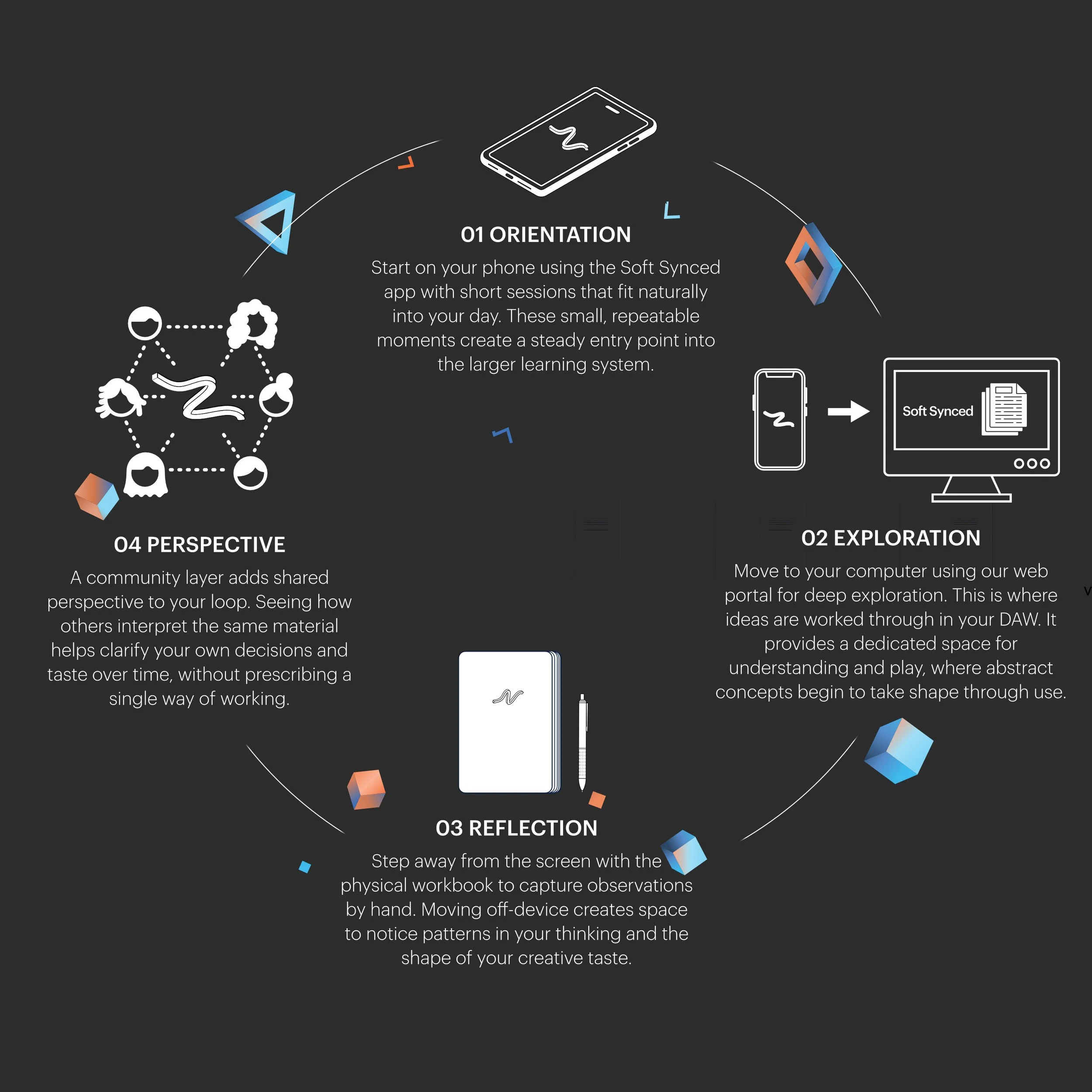 A complete ecosystem for music producers combining mobile lessons, deep-dive guides, and hands-on, physical workbooks.